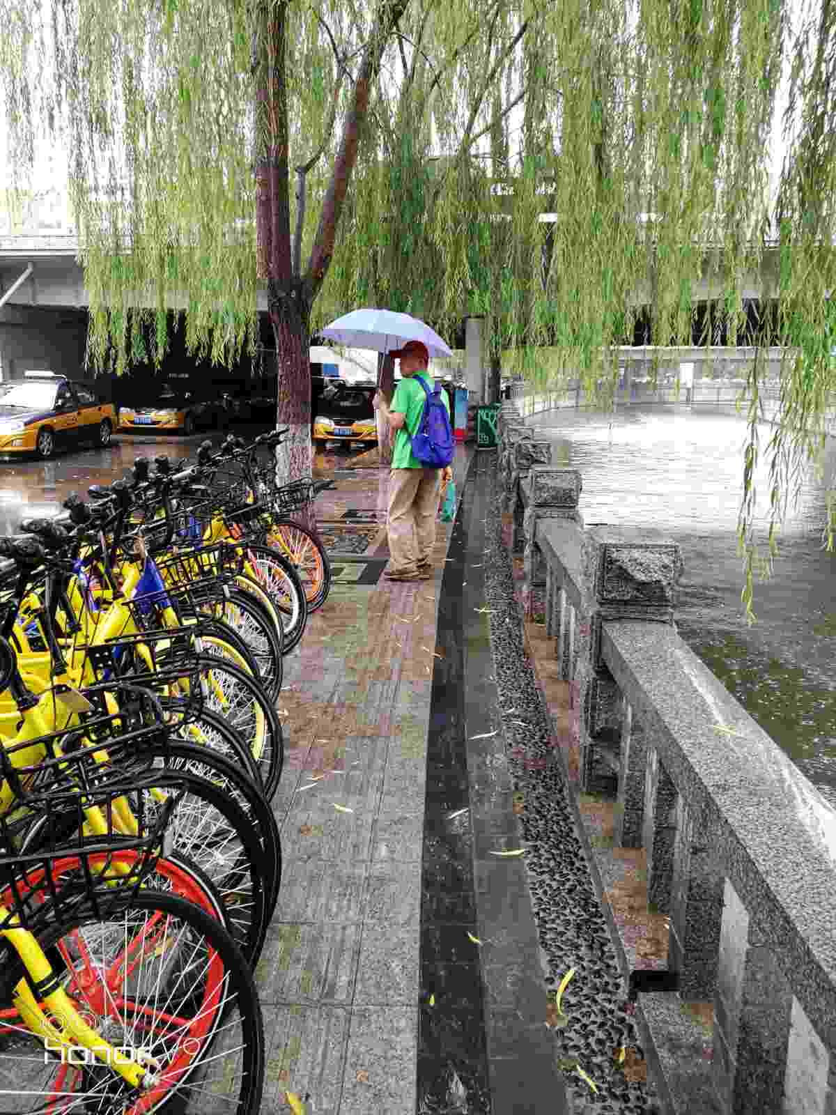 2018年7月11日星期三气温下降25℃,预报中到大雨。刘杰、勾会清早8点刚过冒雨来到德胜门滨河路。开始了第85周,第3天的环境巡视。由于天气原因今天去往八达岭的游客明显减少,877公交形成车等人的局面,滨河路清静了许多。